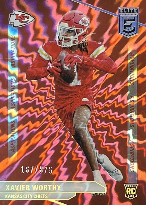 The Xavier Worthy 2024 Elite #186 Aspirations Shimmer /875 Rookie card in Raw condition has moved up $1.00 (+101%) in the last 30 days and was last sold for $1.99 .