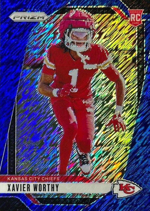 The Xavier Worthy 2024 Prizm #399 Blue Shimmer /25 Rookie card in Raw condition has not changed in price in the last 30 days and was last sold for $46.00 .