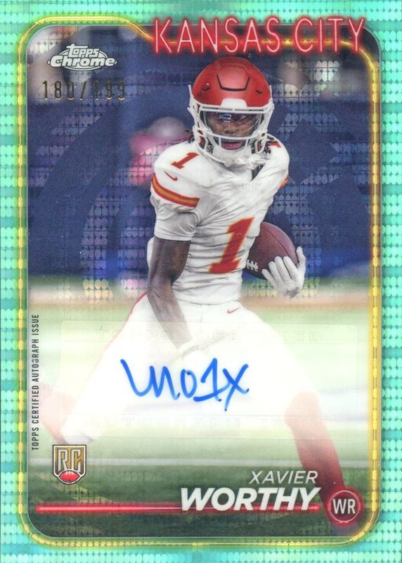 The Xavier Worthy 2024 Topps Chrome #RA-XWO Rookie Auto - Aqua Sonar Refractor /199 card in Raw condition has moved up $31.55 (+171%) in the last 30 days and was last sold for $50.00 .
