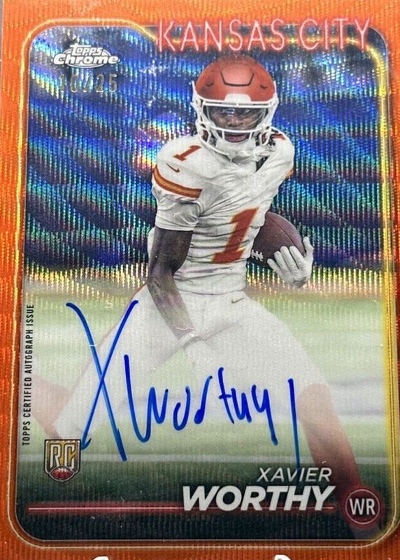 The Xavier Worthy 2024 Topps Chrome #RA-XWO Rookie Auto - Orange Wave Refractor /25 card in Raw condition has not changed in price in the last 30 days and was last sold for $150.00 .