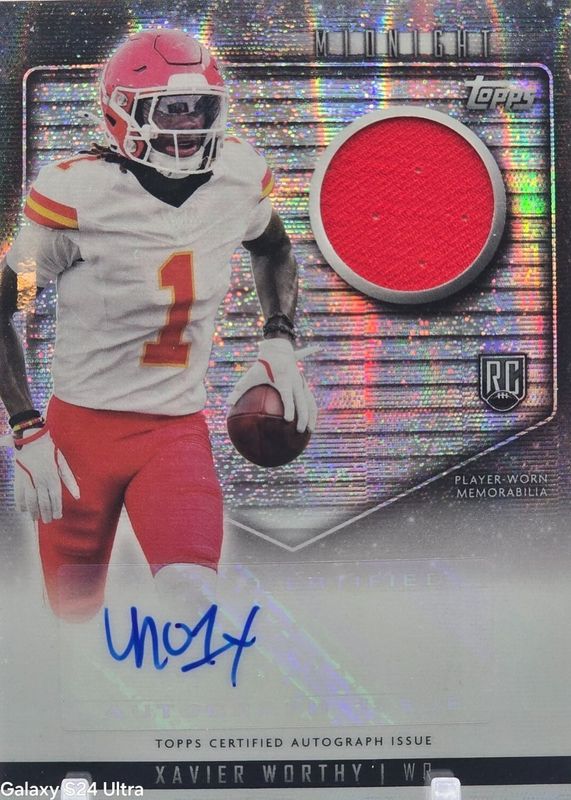 The Xavier Worthy 2024 Topps Midnight #RJA-XW Rookie Jersey Autographs - Moon Beam card in Raw condition has not changed in price in the last 30 days and was last sold for $10.08 .