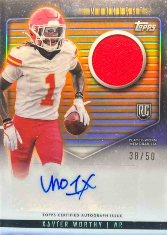 The Xavier Worthy 2024 Topps Midnight #RJA-XW Rookie Jersey Autographs - Summer Solstice /50 card in Raw condition has not changed in price in the last 30 days and was last sold for $50.00 .