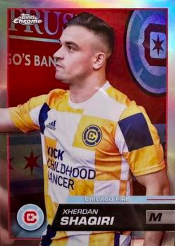 The Xherdan Shaqiri 2023 Topps Chrome MLS #52b Base card is 1 of 21 Xherdan Shaqiri's card variations in the 2023 Topps Chrome MLS set being tracked by Sports Card Investor, including Base, Pink X-Fractor, Refractor, Speckle Refractor, and Blue Mini-Diamond Refractor /199.