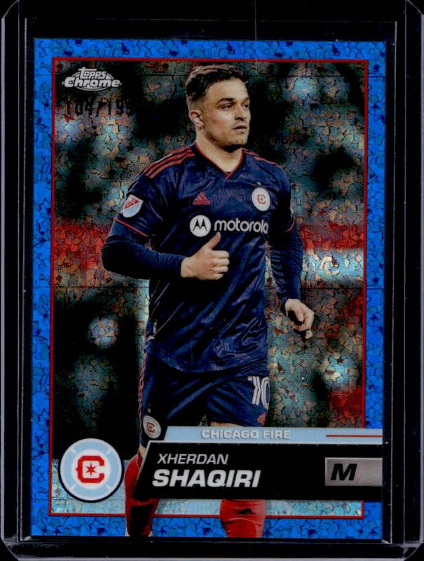 The Xherdan Shaqiri 2023 Topps Chrome MLS #52 Blue Mini-Diamond Refractor /199 card is 1 of 21 Xherdan Shaqiri's card variations in the 2023 Topps Chrome MLS set being tracked by Sports Card Investor, including #52 Base, #52b Base, #52 Pink X-Fractor, #52 Refractor, and #52 Speckle Refractor.