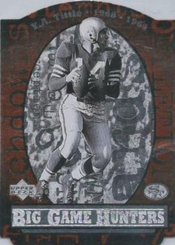 The YA Tittle 1997 Upper Deck Legends #B12 Big Game Hunters Die Cuts card is 1 of 3 YA Tittle's card variations in the 1997 Upper Deck Legends set being tracked by Sports Card Investor, including Base, and Autographs.
