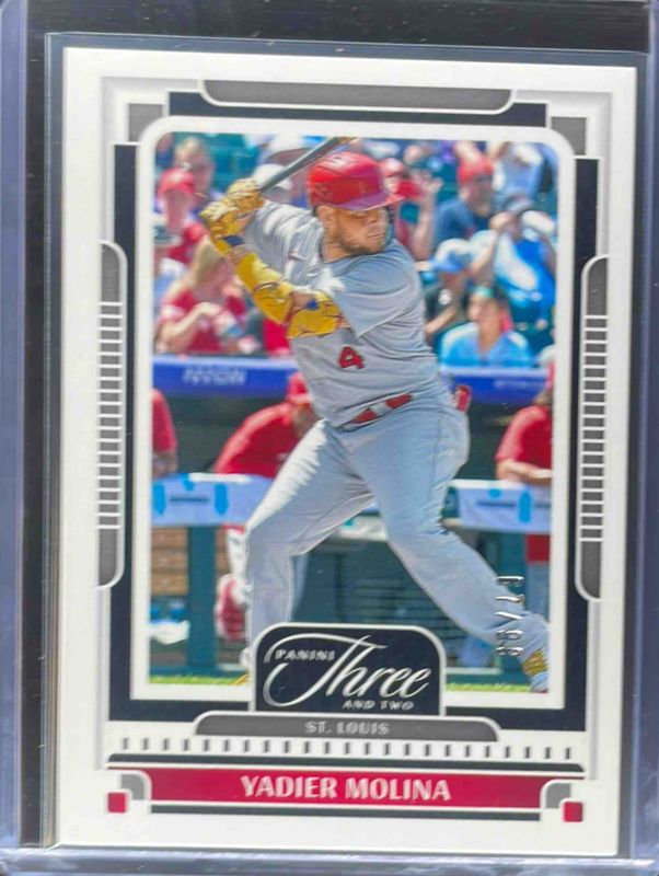 The Yadier Molina 2025 Panini Three and Two #150 Base /99 card is 1 of 10 Yadier Molina's card variations in the 2025 Panini Three and Two set being tracked by Sports Card Investor, including Holo Silver /49, Full Count /32, Navy Blue /25, Holo Blue /15, and Holo Gold /10.