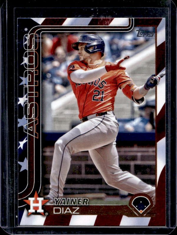 The Yainer Diaz 2025 Topps #299 Independence Day /76 card is 1 of 63 Yainer Diaz's card variations in the 2025 Topps set being tracked by Sports Card Investor, including Base, Aqua Holo Foil, Diamante Foil, Holo Foil, and Pink Diamante Foil.