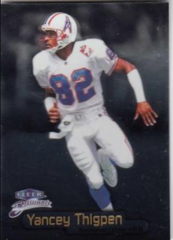 The Yancey Thigpen 1998 Fleer Brilliants #98 Base card is 1 of 5 Yancey Thigpen's card variations in the 1998 Fleer Brilliants set being tracked by Sports Card Investor, including #98B Blue, #98G Gold /99, #98TG Gold /99, and #98TG 24-Karat Gold /24.