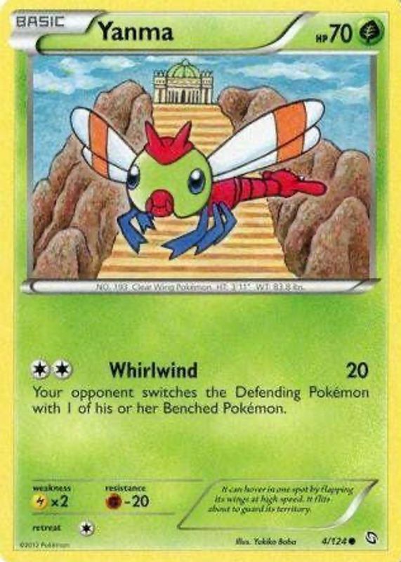 The Yanma 2012 Black & White: Dragons Exalted #004/124 Base card in Raw TCG (Near Mint) condition has not changed in price in the last 30 days and was last sold for $0.99 .