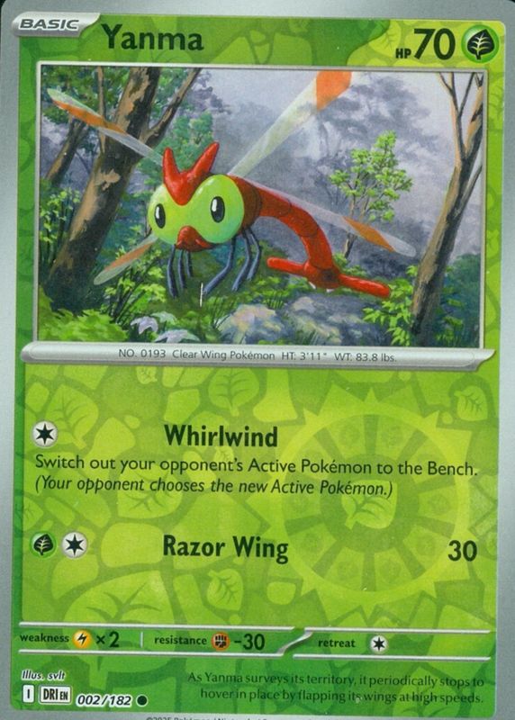 The Yanma 2025 Scarlet & Violet: Destined Rivals #002/182 Reverse Holo card in Raw TCG (Near Mint) condition has moved up $0.50 (+33.6%) in the last 30 days and was last sold for $1.99 .