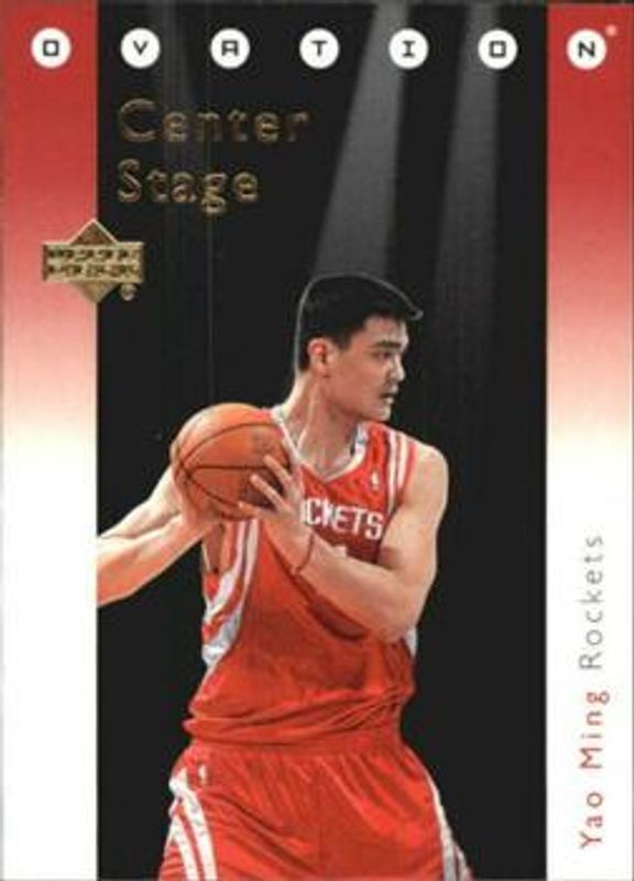 The Yao Ming 2006 Upper Deck Ovation #CS-YM Center Stage card is 1 of 6 Yao Ming's card variations in the 2006 Upper Deck Ovation set being tracked by Sports Card Investor, including Base /999, Gold /99, Leading Performers, Spotlight Signatures, and Spotlight Signatures Gold /25.