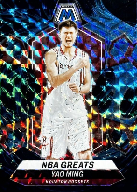 This card is 1 of 23 Yao Ming's card variations in the 2023 Mosaic set being tracked by Sports Card Investor, including NBA Greats - Choice Peacock /(SSP), NBA Greats - Fast Break Purple /50, NBA Greats - Glitter /(SSP), NBA Greats - White Sparkle /(SSP), and NBA Greats - International Blue /25.