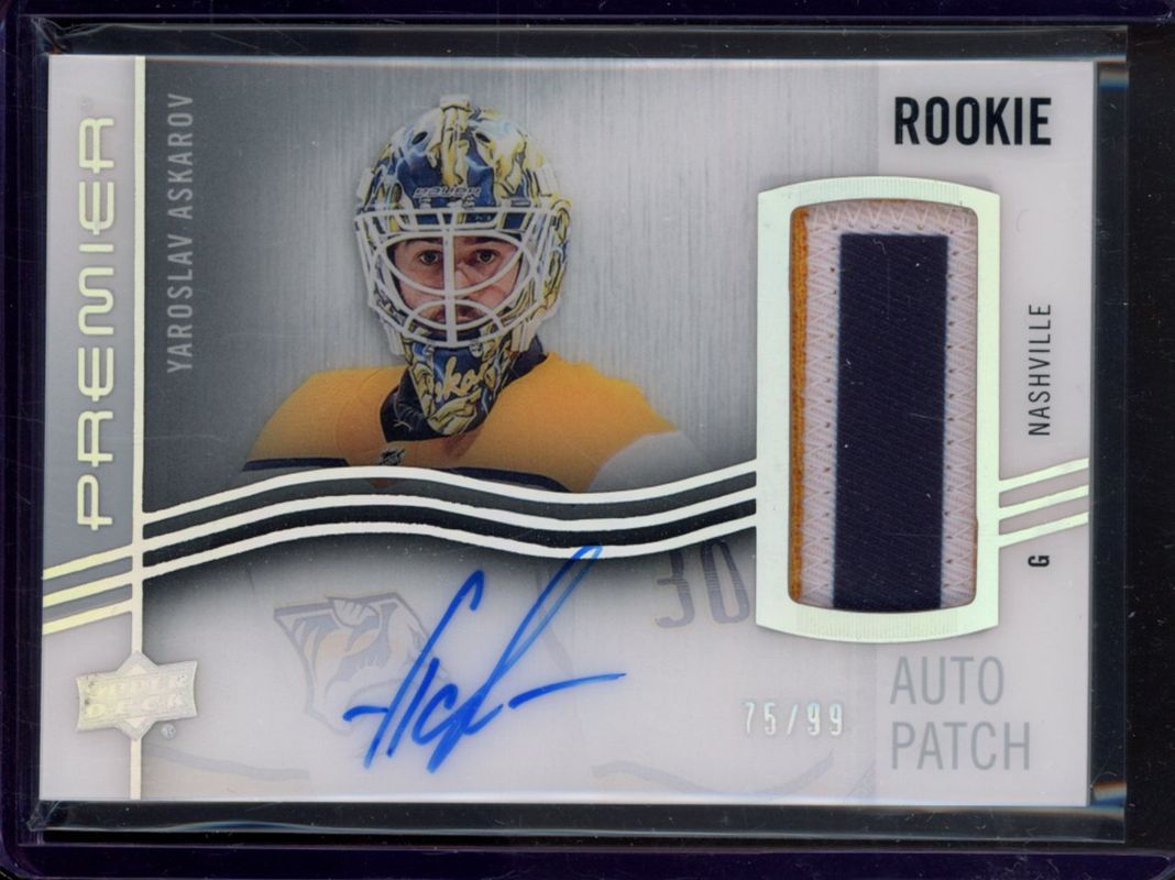The Yaroslav Askarov 2023 Upper Deck Premier #AHR-YA Acetate Rookie Auto Patch Horizontal /49 card is 1 of 33 Yaroslav Askarov's card variations in the 2023 Upper Deck Premier set being tracked by Sports Card Investor, including Base /399, Bronze /199, Gold /65, Ruby /49, and Rose Gold /25.