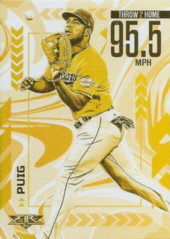 The Yasiel Puig 2020 Topps Fire #AA-2 Arms Ablaze - Gold Minted card is 1 of 3 Yasiel Puig's card variations in the 2020 Topps Fire set being tracked by Sports Card Investor, including Arms Ablaze, and Arms Ablaze - Blue Chip.