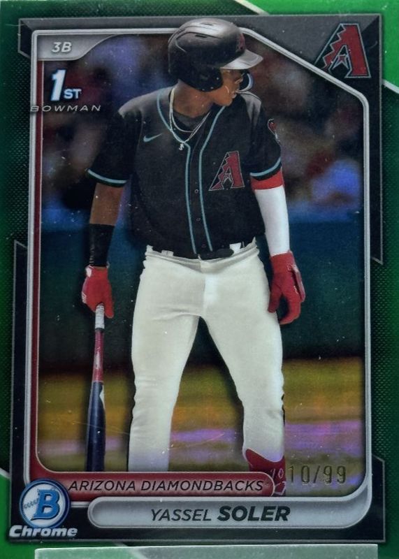 The Yassel Soler 2024 Bowman Chrome #BCP-174 Prospects - Green Refractor /99 (1st) card in Raw condition has not changed in price in the last 30 days and was last sold for $10.00 .