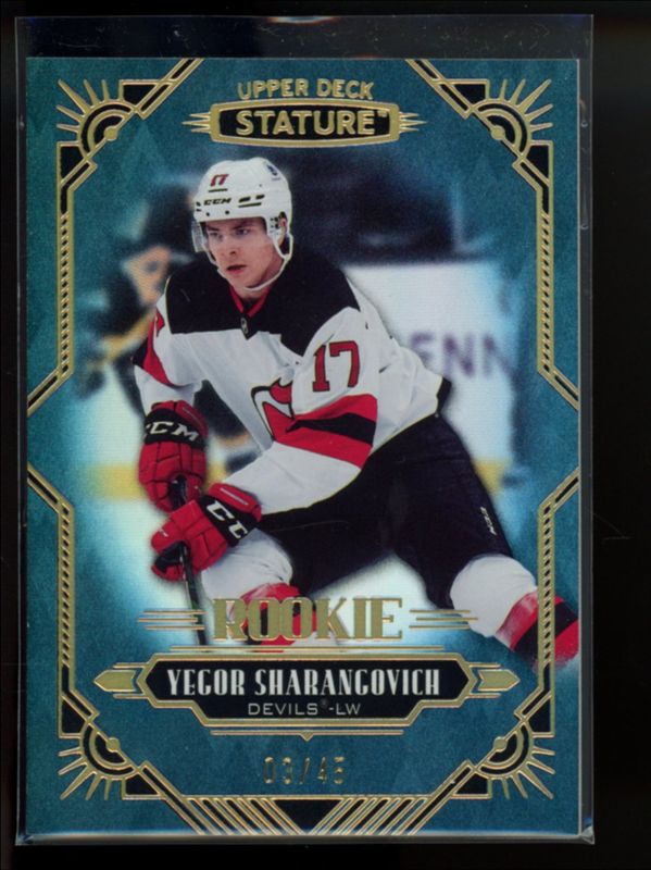 The Yegor Sharangovich 2020 Upper Deck Stature #127 Blue /45 Rookie card is 1 of 26 Yegor Sharangovich's card variations in the 2020 Upper Deck Stature set being tracked by Sports Card Investor, including Base /399, Autographs /199, Green /175, Portrait /99, and Autographs Green /85.