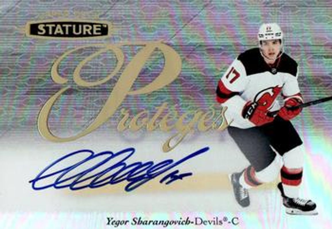 The Yegor Sharangovich 2020 Upper Deck Stature #P-26 Proteges Autographs Rookie card is 1 of 26 Yegor Sharangovich's card variations in the 2020 Upper Deck Stature set being tracked by Sports Card Investor, including Base /399, Autographs /199, Green /175, Portrait /99, and Autographs Green /85.