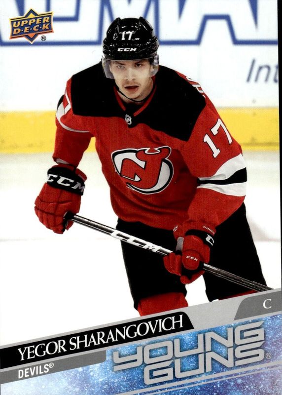 This card is 1 of 10 Yegor Sharangovich's card variations in the 2020 Upper Deck set being tracked by Sports Card Investor, including Young Guns Base, Young Guns Canvas, Young Guns - Clear Cut, Young Guns - Clear Cut Exclusives, and Young Guns - French.