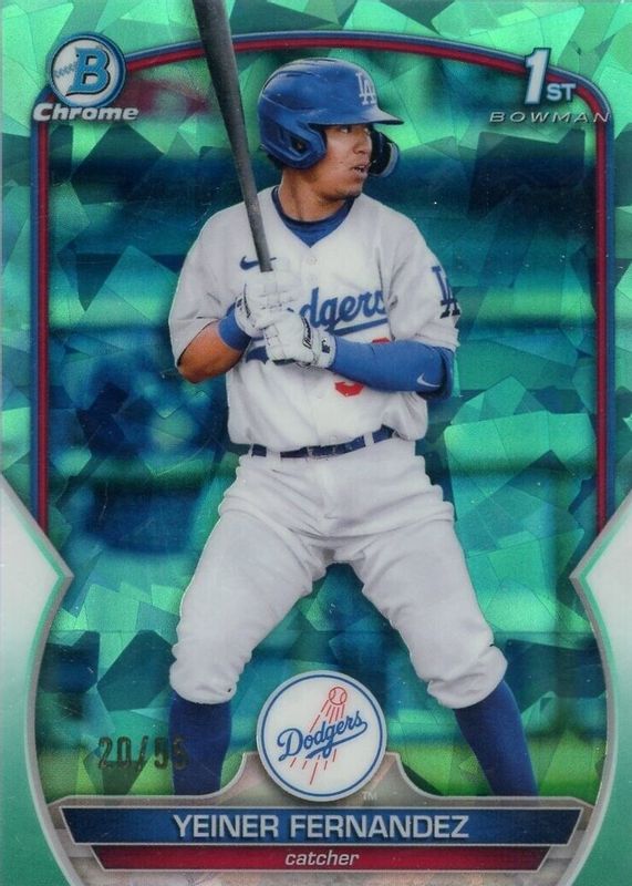 This card is 1 of 7 Yeiner Fernandez's card variations in the 2023 Bowman Sapphire Edition set being tracked by Sports Card Investor, including Chrome Prospects (1st), Chrome Prospects - Green /60 (1st), Chrome Prospects - Orange /50 (1st), Chrome Prospects - Purple /25 (1st), and Chrome Prospects - Red /10 (1st).