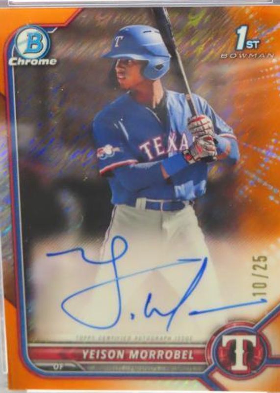 The Yeison Morrobel 2022 Bowman Chrome #CPA-YML Prospect Auto - Orange Shimmer Refractor /25 (1st) card in Raw condition has not changed in price in the last 30 days and was last sold for $26.00 .