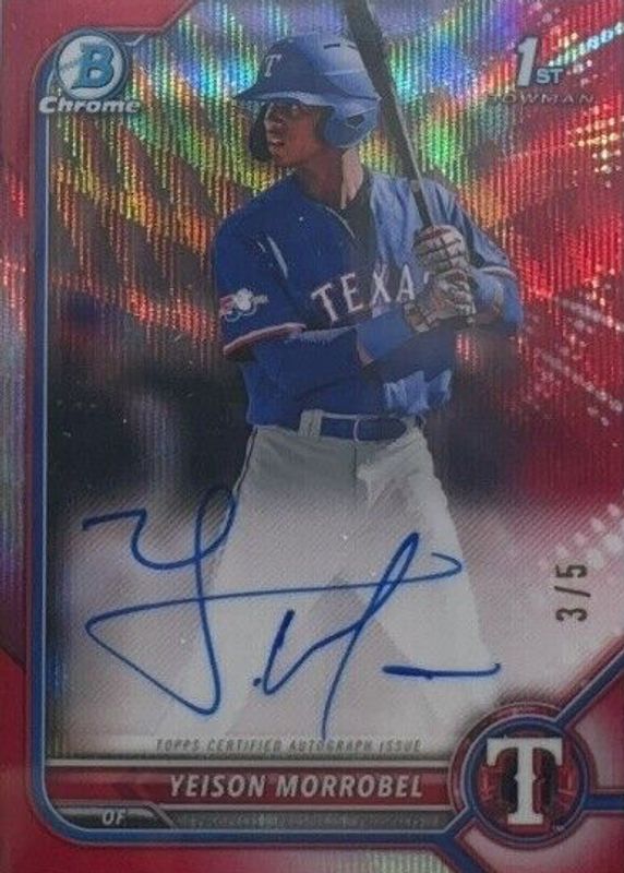 The Yeison Morrobel 2022 Bowman Chrome #CPA-YML Prospect Auto - Red Wave Refractor /5 (1st) card in Raw condition has not changed in price in the last 30 days and was last sold for $63.00 .