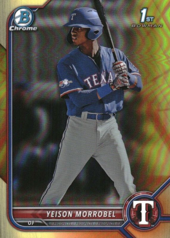 This card is 1 of 47 Yeison Morrobel's card variations in the 2022 Bowman Chrome set being tracked by Sports Card Investor, including Prospects (1st), Prospects - Black & White Mini-Diamond Refractor (1st), Prospects - Shimmer Refractor (1st), Prospects - Refractor /499 (1st), and Prospects - Speckle Refractor /299 (1st).