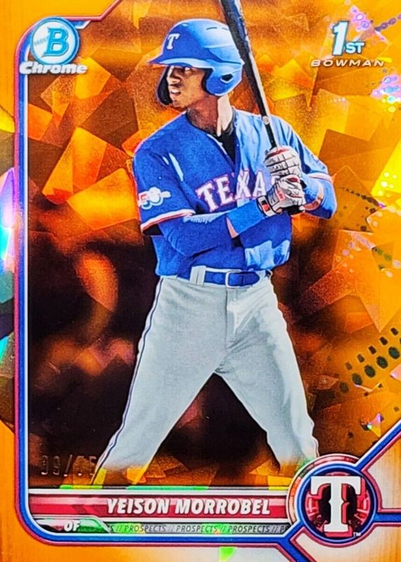 This card is 1 of 7 Yeison Morrobel's card variations in the 2022 Bowman Chrome Sapphire Edition set being tracked by Sports Card Investor, including Prospects (1st), Prospects - Aqua /99 (1st), Prospects - Yellow /50 (1st), Prospects - Purple /25 (1st), and Prospects - Red /5 (1st).