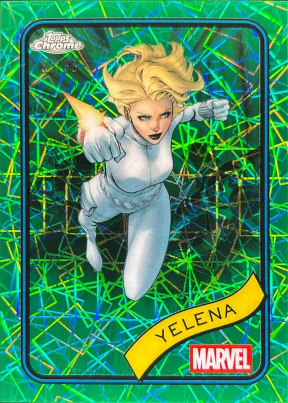 The Yelena 2025 Topps Chrome #83 Hulk Green Lazer Refractor /99 card is 1 of 23 Yelena's card variations in the 2025 Topps Chrome set being tracked by Sports Card Investor, including Base, Refractor, Yellow Lava Refractor, Spider Web Refractor /399, and Blue Refractor /299.