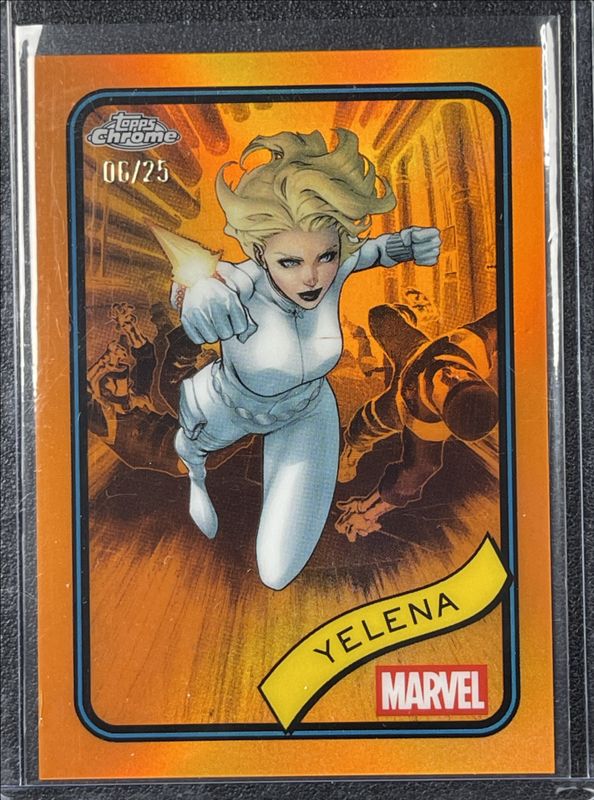 The Yelena 2025 Topps Chrome #83 Orange Refractor /25 card is 1 of 23 Yelena's card variations in the 2025 Topps Chrome set being tracked by Sports Card Investor, including Base, Refractor, Yellow Lava Refractor, Spider Web Refractor /399, and Blue Refractor /299.