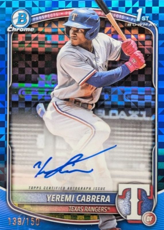 L239 YEREMI CABRERA RC AUTO 2025 BOWMAN CHROME 1ST BLUE XFRACTOR /150 RANGERS
