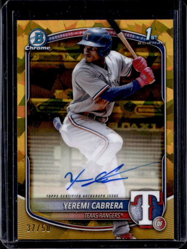 The Yeremi Cabrera 2025 Bowman Sapphire Edition #CPS-YC Chrome Prospect Autographs - Gold Refractor /50 card is 1 of 16 Yeremi Cabrera's card variations in the 2025 Bowman Sapphire Edition set being tracked by Sports Card Investor, including Chrome Prospects, Chrome Prospect Autographs /199, Chrome Prospect Autographs - Green Refractor /99, Chrome Prospects - Green Refractor /99, and Chrome Prospects - Yellow Refractor /75.