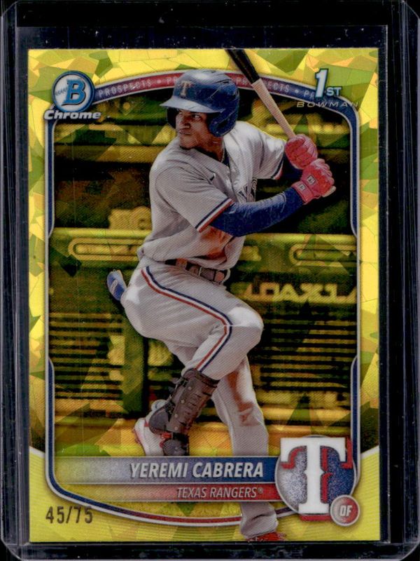 The Yeremi Cabrera 2025 Bowman Sapphire Edition #BCP-146 Chrome Prospects - Yellow Refractor /75 card is 1 of 16 Yeremi Cabrera's card variations in the 2025 Bowman Sapphire Edition set being tracked by Sports Card Investor, including Chrome Prospects, Chrome Prospect Autographs /199, Chrome Prospect Autographs - Green Refractor /99, Chrome Prospects - Green Refractor /99, and Chrome Prospect Autographs - Gold Refractor /50.
