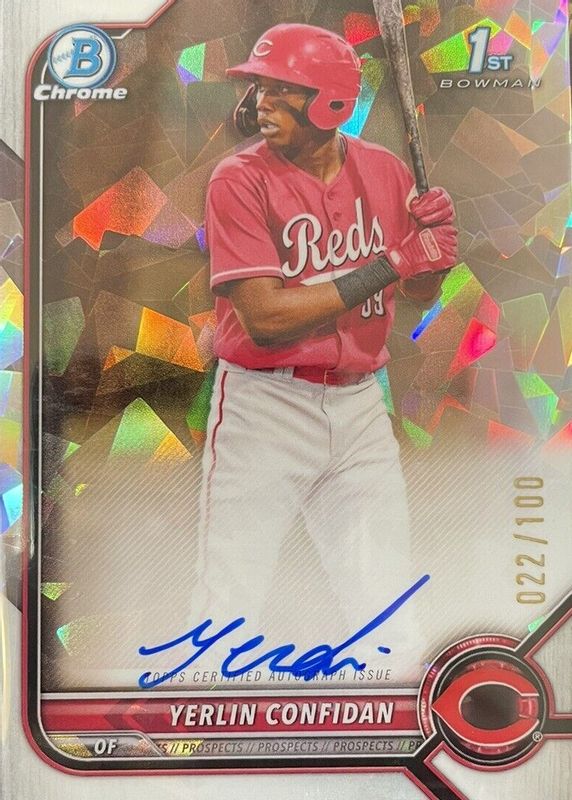 This card is 1 of 22 Yerlin Confidan's card variations in the 2022 Bowman Chrome set being tracked by Sports Card Investor, including Prospect Auto (1st), Prospect Auto - Black & White Mini-Diamond Refractor (1st), Prospect Auto - Refractor /499 (1st), Prospect Auto - Speckle Refractor /299 (1st), and Prospect Auto - Purple Refractor /250 (1st).