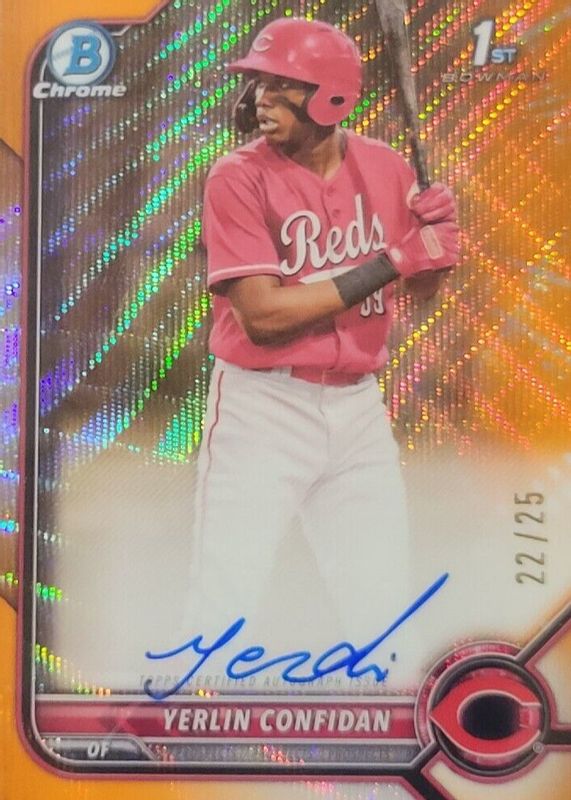 The Yerlin Confidan 2022 Bowman Chrome #CPA-YC Prospect Auto - Orange Wave Refractor /25 (1st) card in Raw condition has not changed in price in the last 30 days and was last sold for $62.69 .