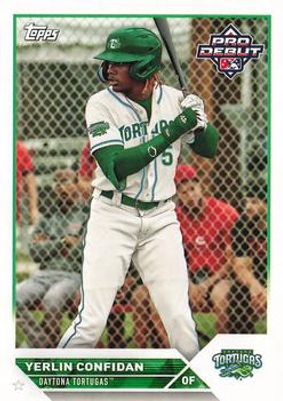 The Yerlin Confidan 2023 Topps Pro Debut #PD-142 Base card is 1 of 32 Yerlin Confidan's card variations in the 2023 Topps Pro Debut set being tracked by Sports Card Investor, including Fuchsia /199, Sparkle /175, Blue /150, Green /99, and Aqua /75.