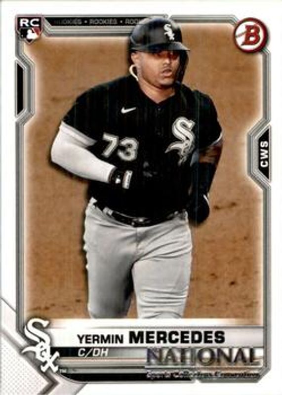 The Yermin Mercedes 2021 Topps National Convention #24 Base Rookie card is 1 of 8 Yermin Mercedes' card variations in the 2021 Topps National Convention set being tracked by Sports Card Investor, including Gold /50, Orange /25, Red /5, FoilFractor /1, and Foil Autographs /10.