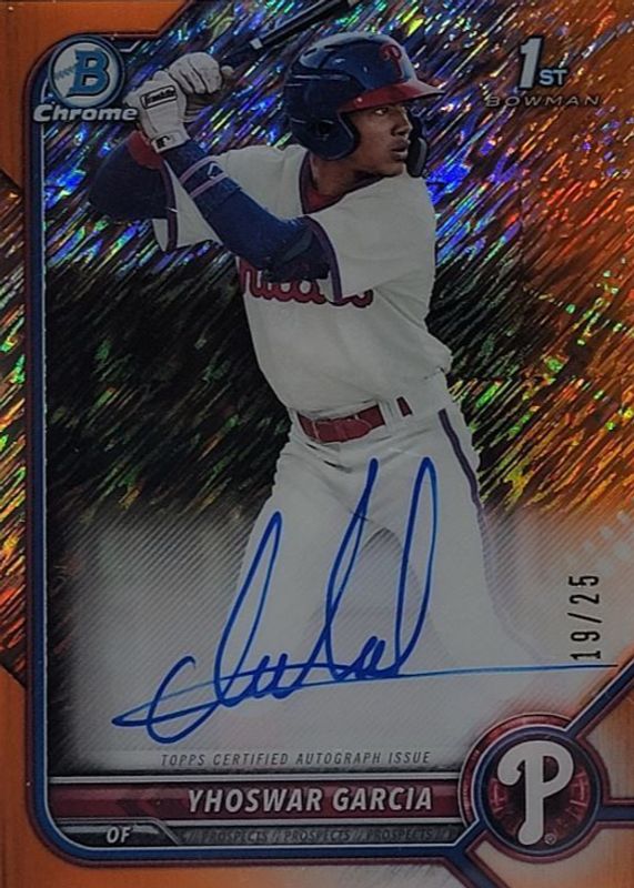 Auctions Ending Soon for Yhoswar Garcia 2022 Bowman #CPA-YG Chrome Prospect Auto - Orange Shimmer Refractor /25 (1st) RAW