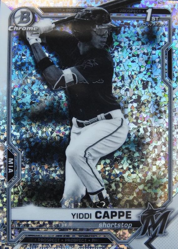 This card is 1 of 24 Yiddi Cappe's card variations in the 2021 Bowman Chrome set being tracked by Sports Card Investor, including Prospects (1st), Prospects - Shimmer Refractor (1st), Prospects - Refractor /499 (1st), Prospects - Speckle Refractor /299 (1st), and Prospects - Purple Refractor /250 (1st).