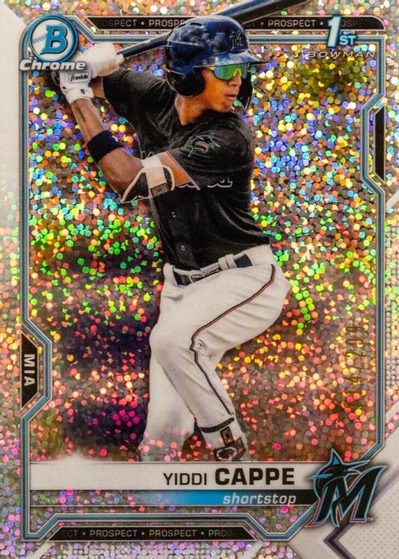 This card is 1 of 24 Yiddi Cappe's card variations in the 2021 Bowman Chrome set being tracked by Sports Card Investor, including Prospects (1st), Prospects - Black & White Mini-Diamond Refractor (1st), Prospects - Shimmer Refractor (1st), Prospects - Refractor /499 (1st), and Prospects - Purple Refractor /250 (1st).