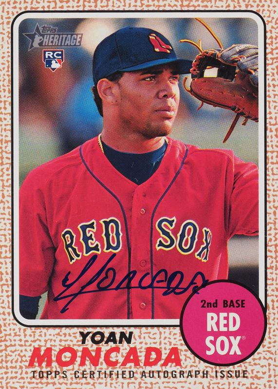 This card is 1 of 2 Yoan Moncada's card variations in the 2017 Topps Heritage High Number set being tracked by Sports Card Investor, including Real One Autographs - Red Ink /68 (Bat on Shoulder).