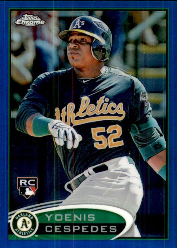 The Yoenis Cespedes 2012 Topps Chrome #180 Blue Refractor /199 (Green Jersey) Rookie card in Raw condition has not changed in price in the last 30 days and was last sold for $9.00 .