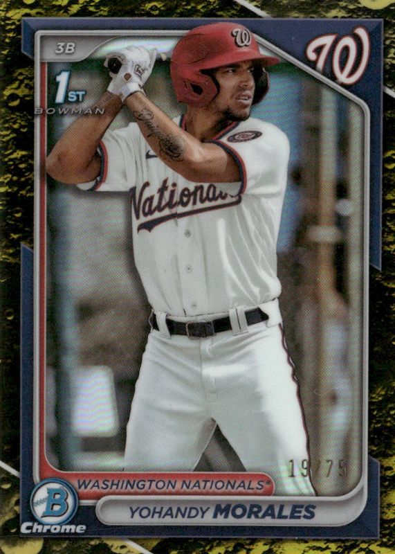 This card is 1 of 71 Yohandy Morales' card variations in the 2024 Bowman set being tracked by Sports Card Investor, including Chrome Prospects (1st), Paper Prospects (1st), Chrome Prospects - Lunar Glow Refractor (1st), Chrome Prospects - Mini-Diamond Refractor (1st), and Chrome Prospects - Pearl Refractor (1st).