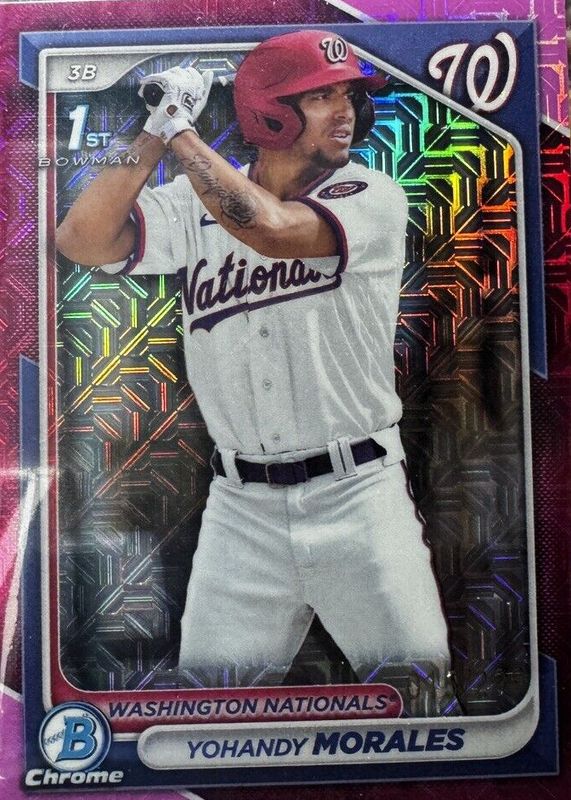 This card is 1 of 13 Yohandy Morales' card variations in the 2024 Bowman Mega Box set being tracked by Sports Card Investor, including Chrome Prospects (1st), Chrome Prospects - Fuchsia Refractor /299 (1st), Chrome Prospects - Purple Refractor /250 (1st), Chrome Prospects - Navy Refractor /175 (1st), and Chrome Prospects - Blue Refractor /150 (1st).