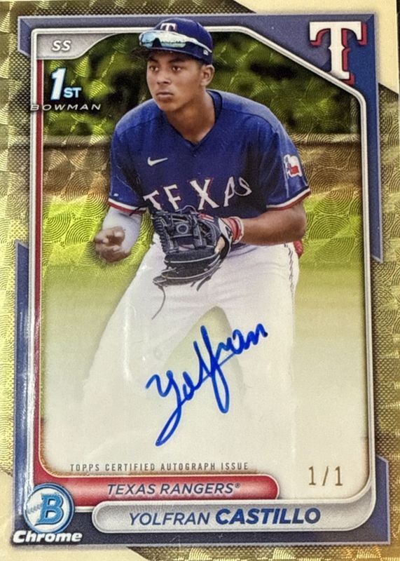 This card is 1 of 51 Yolfran Castillo's card variations in the 2024 Bowman Chrome set being tracked by Sports Card Investor, including Prospects (1st), Prospects - Shimmer Refractor (1st), Prospects - Refractor /499 (1st), Prospects - Speckle Refractor /299 (1st), and Prospects - Purple Refractor /250 (1st).