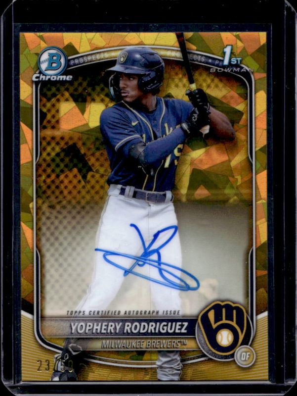 The Yophery Rodriguez 2025 Bowman Sapphire Edition #CPS-YR Chrome Prospect Autographs - Gold Refractor /50 card is 1 of 16 Yophery Rodriguez's card variations in the 2025 Bowman Sapphire Edition set being tracked by Sports Card Investor, including Chrome Prospects, Chrome Prospect Autographs /199, Chrome Prospect Autographs - Green Refractor /99, Chrome Prospects - Green Refractor /99, and Chrome Prospects - Yellow Refractor /75.