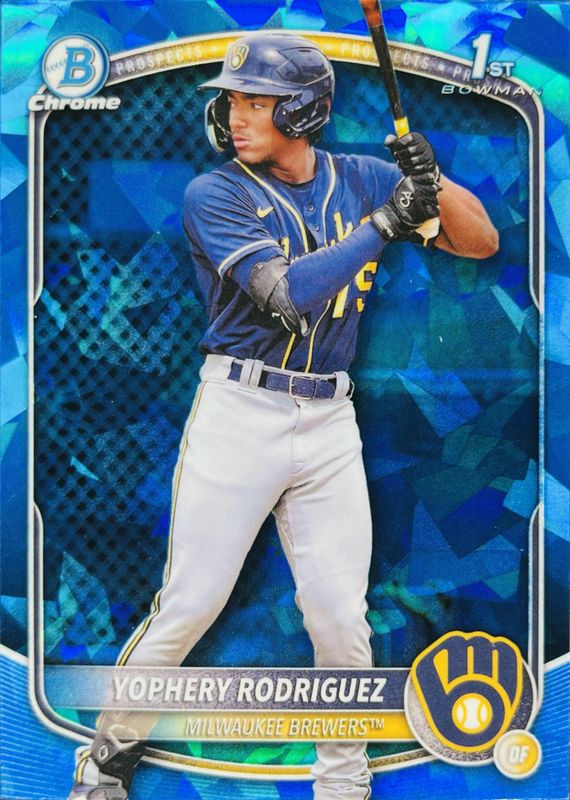 The Yophery Rodriguez 2025 Bowman Sapphire Edition #BCP-36 Chrome Prospects card is 1 of 16 Yophery Rodriguez's card variations in the 2025 Bowman Sapphire Edition set being tracked by Sports Card Investor, including Chrome Prospect Autographs /199, Chrome Prospect Autographs - Green Refractor /99, Chrome Prospects - Green Refractor /99, Chrome Prospects - Yellow Refractor /75, and Chrome Prospect Autographs - Gold Refractor /50.
