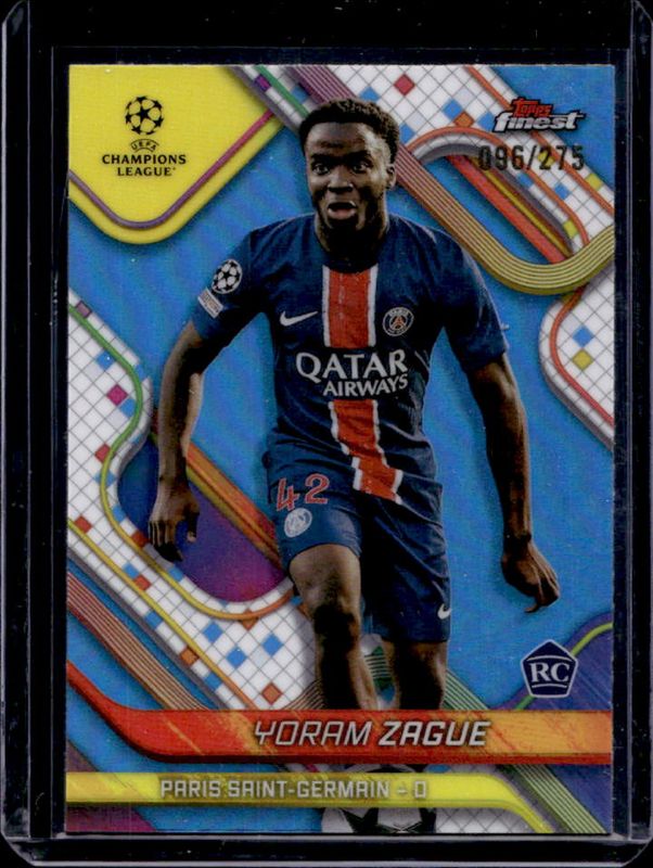 The Yoram Zague 2024 Topps Finest UEFA Club Competitions #12 Sky Blue Refractor /275 card is 1 of 42 Yoram Zague's card variations in the 2024 Topps Finest UEFA Club Competitions set being tracked by Sports Card Investor, including Base, Refractor, Purple Refractor /299, Pink RayWave Refractor /250, and Purple Lava Refractor /199.