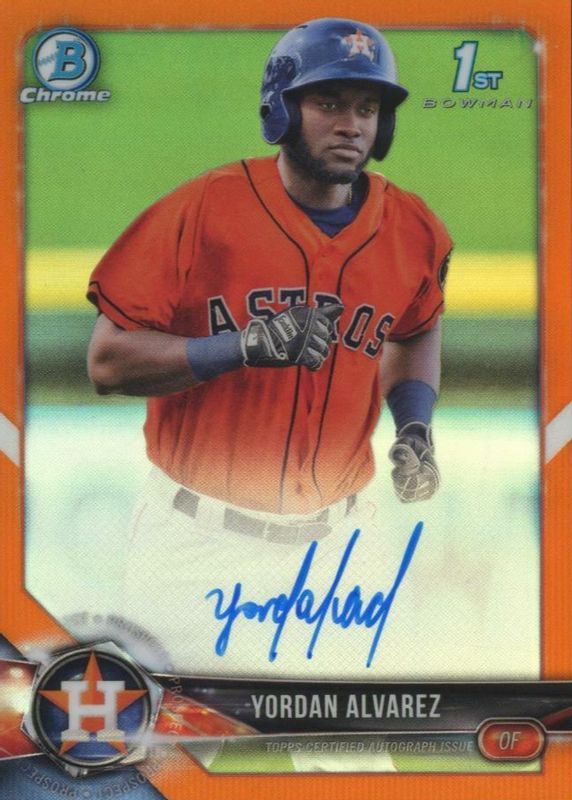 The Yordan Alvarez 2018 Bowman Chrome #CPA-YA Prospect Auto - Orange Refractor /25 (1st) card in Raw condition has not changed in price in the last 30 days and was last sold for $4,799.99 .