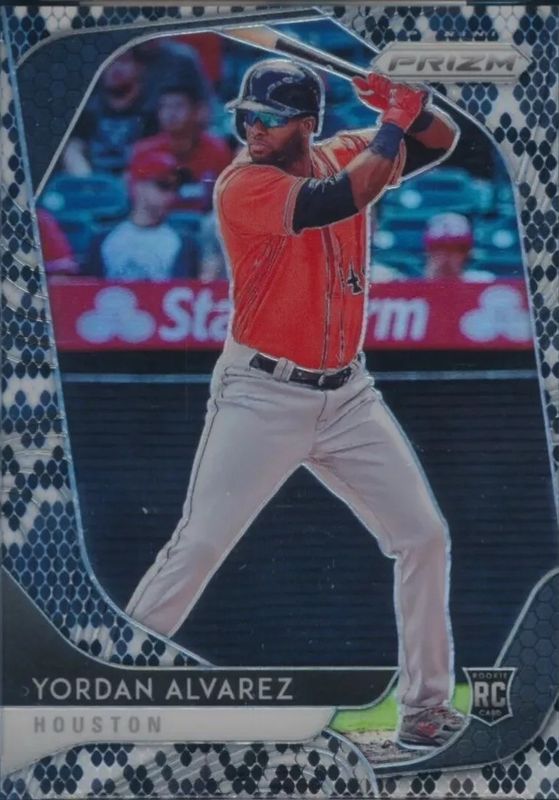 The Yordan Alvarez 2020 Prizm #181 Snakeskin /50 Rookie card is 1 of 97 Yordan Alvarez's card variations in the 2020 Prizm set being tracked by Sports Card Investor, including Base, Blue, Carolina Blue, Cosmic Haze, and Green.