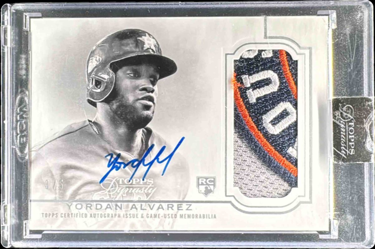 The Yordan Alvarez 2020 Topps Dynasty #DAP-YA4 Silver /5 Rookie card is 1 of 29 Yordan Alvarez's card variations in the 2020 Topps Dynasty set being tracked by Sports Card Investor, including #DAP-YA Rookie Autographed Patch /10, #DAP-YA Rookie Autographed Patch - Silver /5, #DAP-YA2 Base /10, #DAP-YA3 Base /10, and #DAP-YA5 Base /10.
